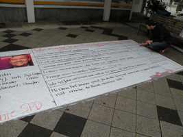 Bodenzeitung zur Bundestagswahl 2013Wo ist denn die SPD? Auch wenn der eine oder andere Innenstadt-Besucher am Samstag in der Ansammlung der Infostände der verschiedenen Parteien vergeblich Ausschau nach dem roten Sonnenschirm der SPD hielt, wir waren da! Nicht nur des regnerischen Wetters wegen hatten wir auf den Sonnenschirm verzichtet. Dieses Mal war es eine ca. 3 x 4 m große Bodenzeitung, die den Passanten auf dem Oberrheinplatz sofort ins Auge fiel.